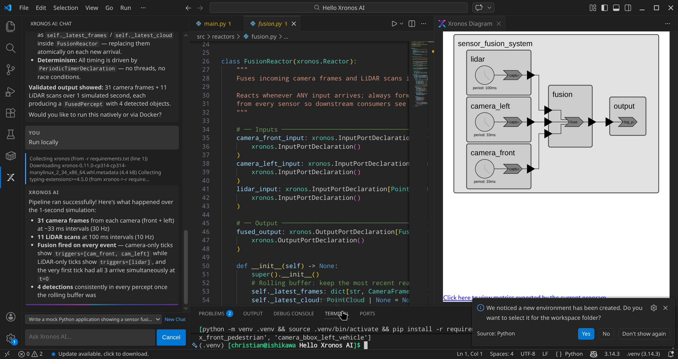 Xronos AI is an intelligent coding assistant built into the Xronos VS Code extension. It understands the Xronos framework and can help you build, debug, and iterate on reactor-based applications directly from your editor.